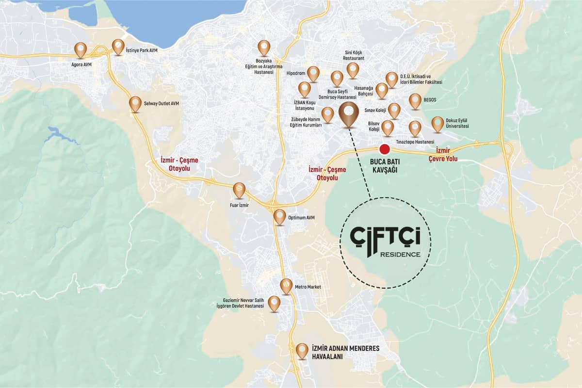 Hastaneler, okullar, AVM’ler ve otobana sadece dakikalar uzaklıkta olan merkezi konumuyla Çiftçi Residence, zamandan tasarruf ederek hayatınıza kolaylık katıyor. Şehrin her yerine yakın, sosyal ve iş yaşamını dengeleyen ayrıcalıklı bir yaşam alanı sunuyor.
