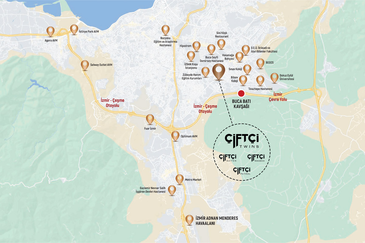 Hastane, okul, avm ve iş merkezlerine yakınlığıyla yaşamı kolaylaştıran Çiftçi Twins, çevre yolu bağlantılarıyla da İzmir’in her noktasına kolayca ulaşabilmenizi sağlıyor.